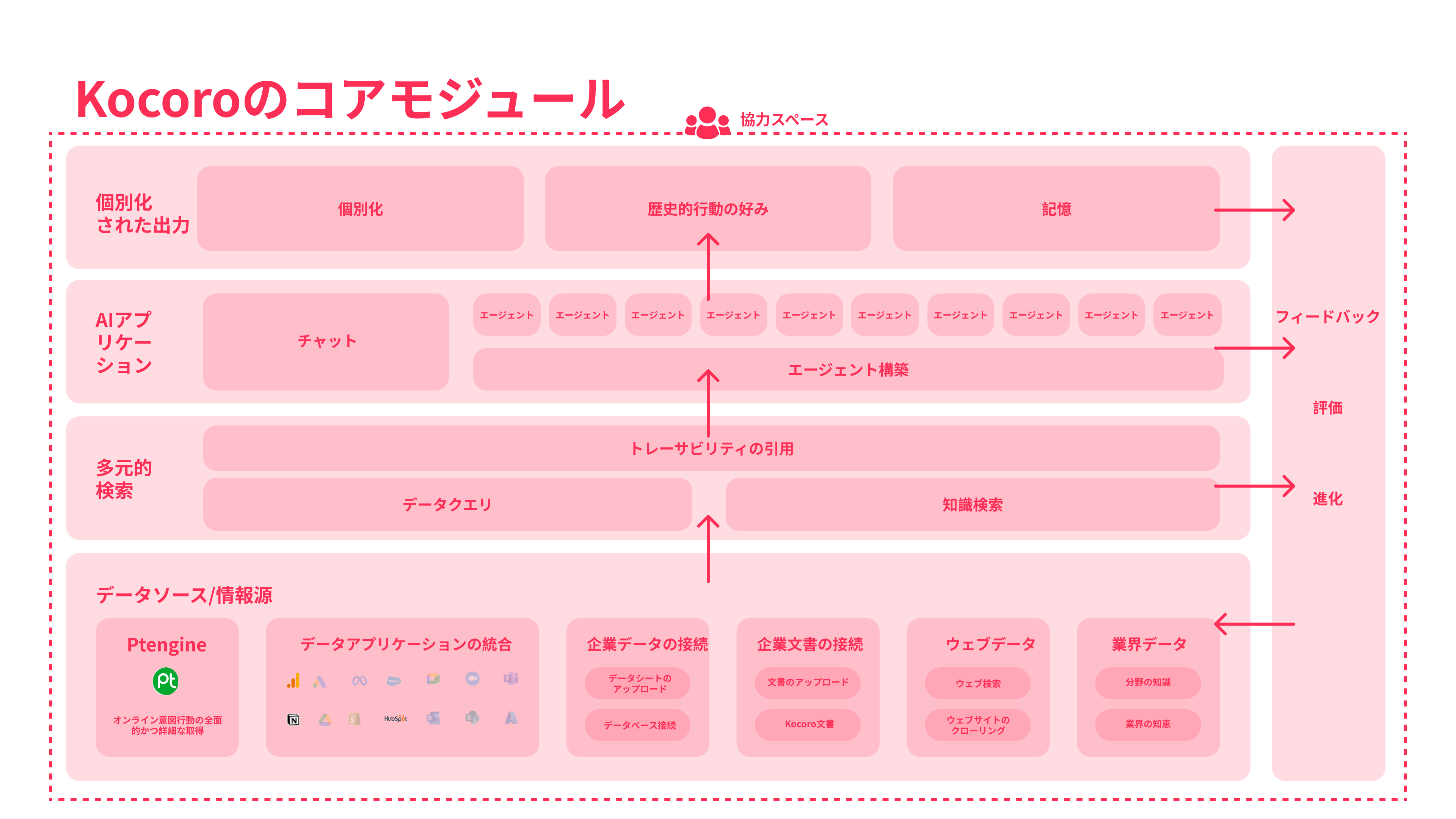 Kocoroは「インテリジェント・コラボレーションスペース」を中核コンセプトとしたプラットフォームです。データドリブンとAIの力で、チームメンバーの効率的な協働とナレッジシェアを実現します。多層的なインテリジェントモジュールを統合し、データ収集・知識検索・AI処理・パーソナライズ出力までを一気通貫で提供。さらに独自の評価メカニズムにより、自律的な最適化と進化を繰り返します。