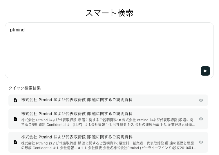 すると、下に「クイック検索結果」がリアルタイムで表示され、キーワードを含むドキュメントの要約が一覧で示されます。素早く内容を確認し、目的のドキュメントを見つけたら、クリックして全文を閲覧できます。