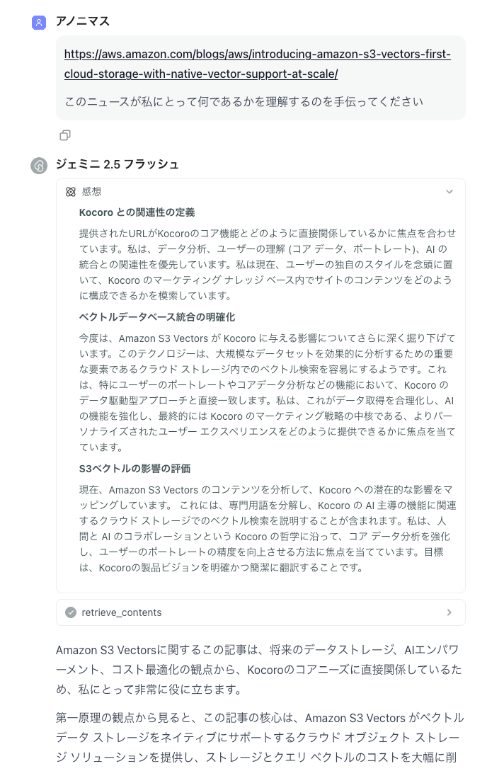 - 指示は明確に:Kocoroへの要望が明確なほど、抽出される内容もより精度が高まります。役割・目的・出力形式を指定して「マーケティング担当としてこの記事を読み、SNSで使える3つのハイライトを抽出」など、具体的に依頼しましょう。