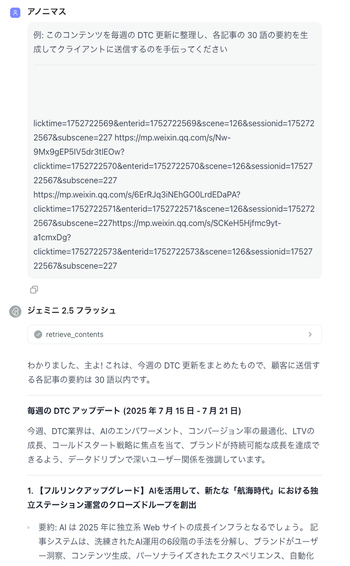 例:いくつかの業界ニュースのリンクを送り、「これらの内容を週次DTC動向にまとめ、各記事30字以内の要約を作成してクライアントに送る」と伝える。