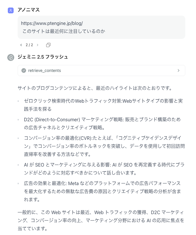 例:競合のブログリンクを送り、「このブログは最近どんな話題に注目しているか教えて」と質問する。