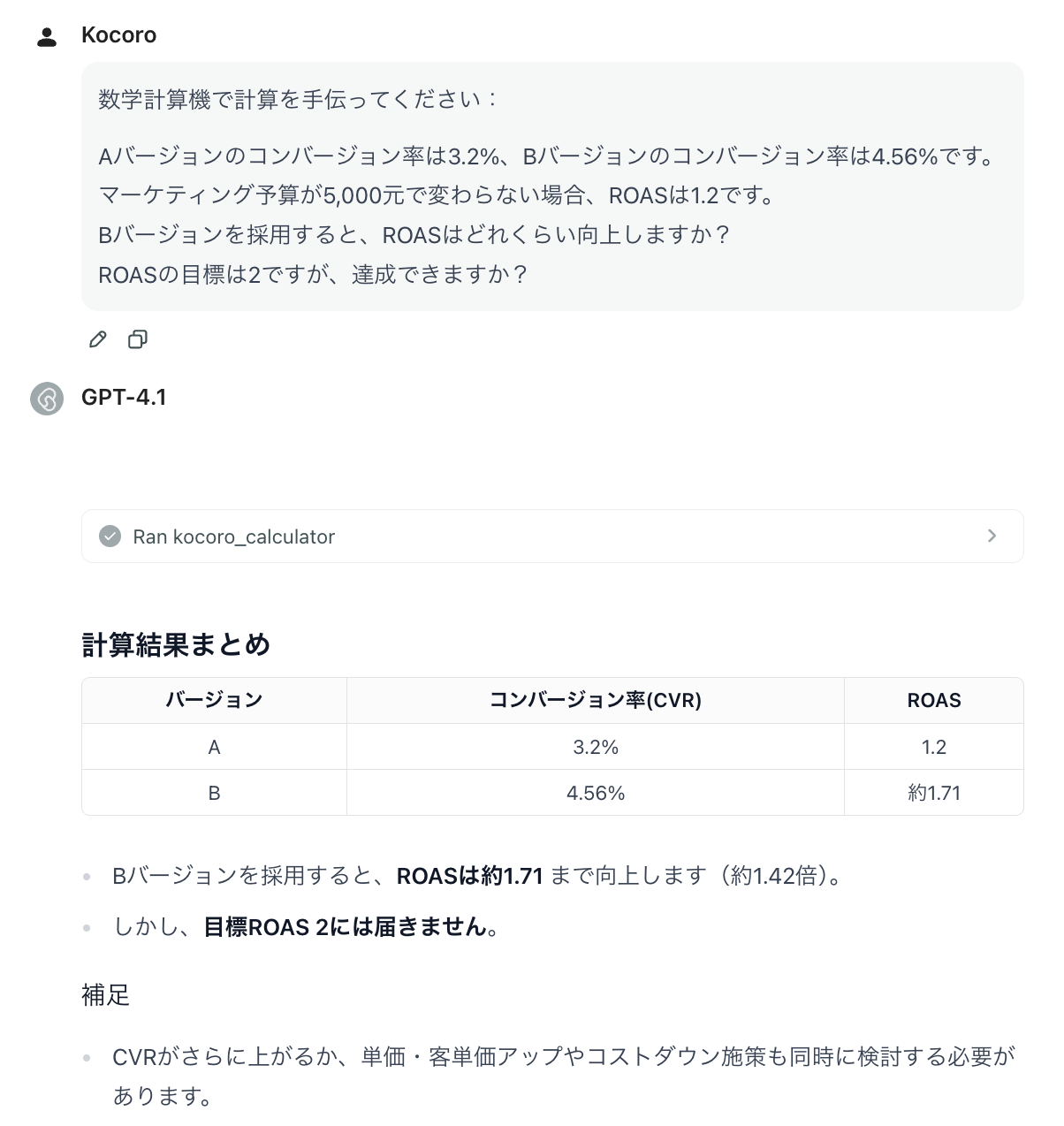 - 指示例2:「Aチャネルの先週の広告費は15,000元、売上は45,000元。ROASを計算してください。」