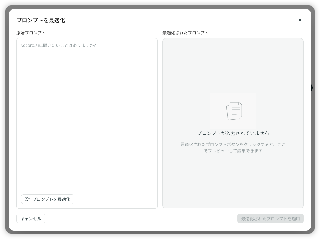 複雑なプロンプトの練習はいりません。やりたいことをふだんの言葉で伝えるだけで、Kocoroが専門性のある正確な指示に整えてくれます。
