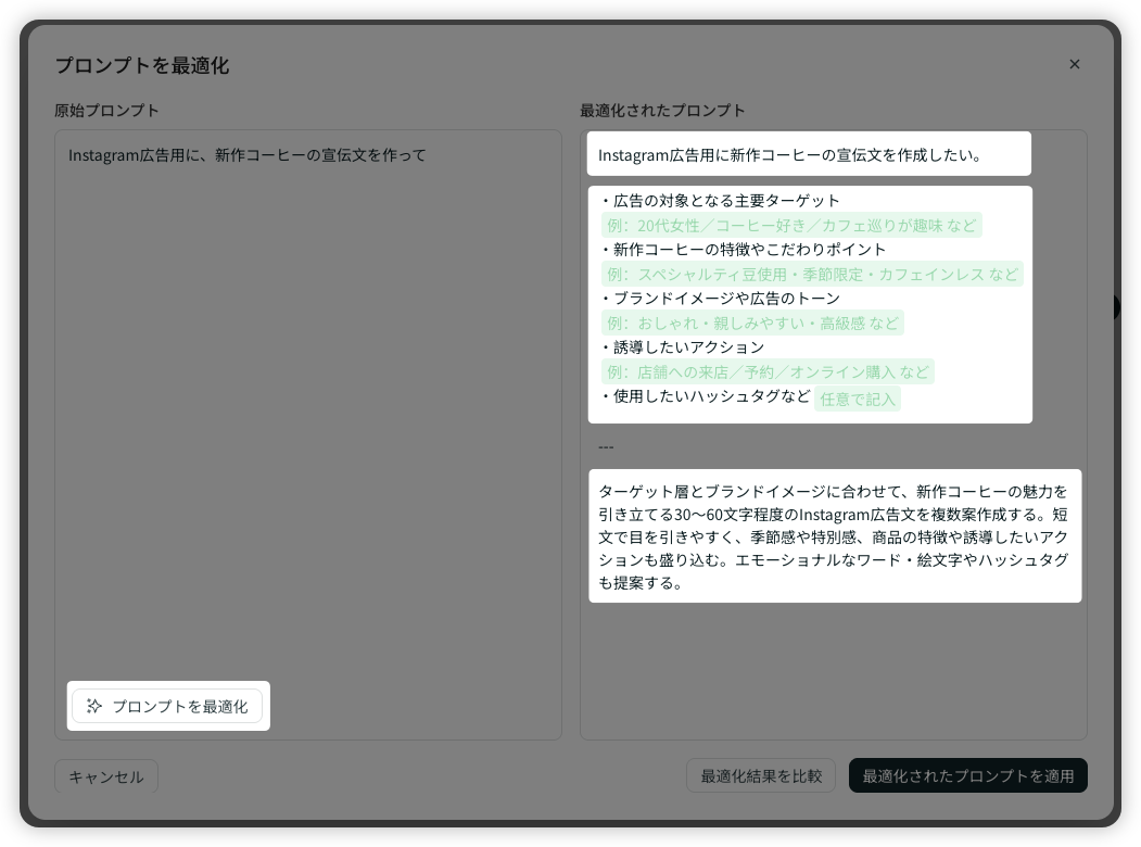 「比較結果」を開くと、元のプロンプトと最適化後のプロンプトで、生成品質を見比べられます。使いどころのポイントも確認できます。