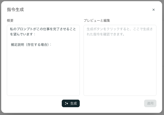 - プレビュー&編集:生成された指示文は全て透明化され、いつでも内容を確認・修正できます。あなたの意図にぴったり合わせられます。