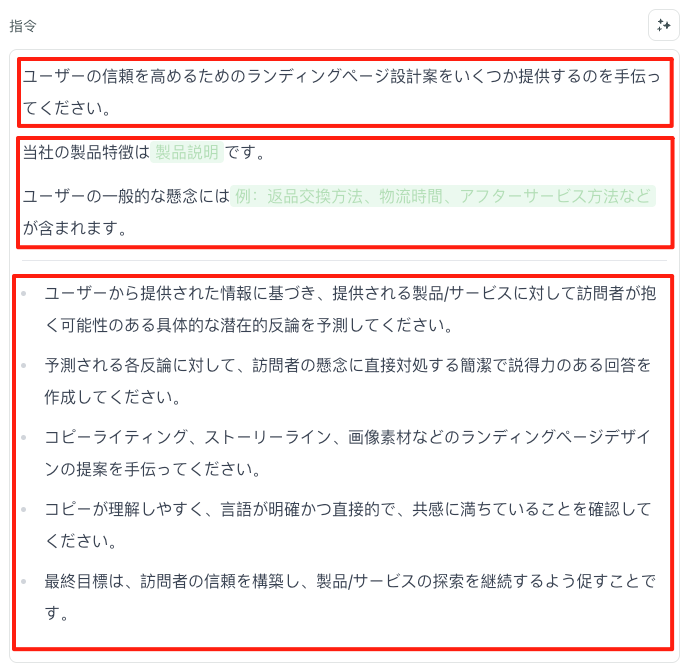 - AIへの詳細な指示: AIの動き方を細かく指定するためのもの。より高品質・安定的な結果を得るために。通常はこの部分を意識する必要はありません。