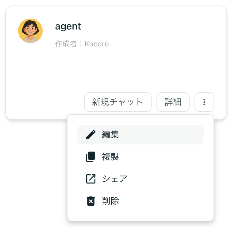 共有したいリソースカード(エージェント、プロンプト、ナレッジドキュメント、ツールすべて対応)の右下にある「その他」ボタン(三点リーダー)をクリックし、表示されたメニューから「共有」を選択します。