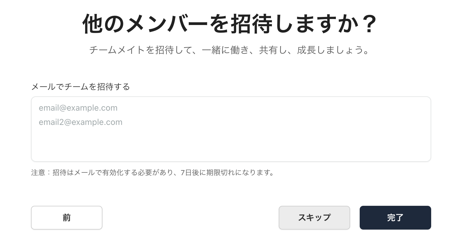 招待したいメンバーがいれば、メールアドレスを入力して直接招待できます(省略可)。