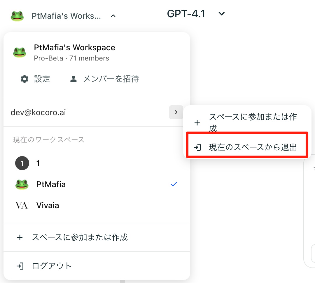 現在のスペースでの業務が終了した場合、「現在のスペースから退出」を選択できます。