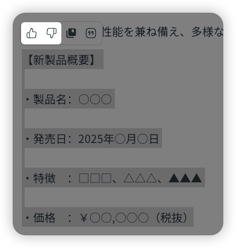 - フィードバックは具体的に:いいね/よくないねは選択範囲にのみ反映。気になる点を具体的に選ぶほど、改善の精度が上がります。