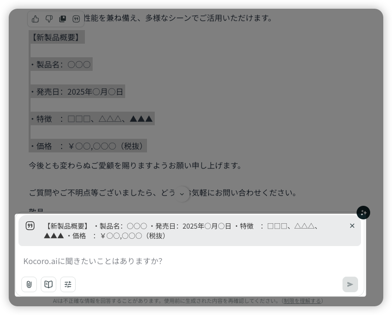 全文を選ばなくても、会話はそのまま続けられます。コンテンツの任意の一部を選択すると、その箇所に合わせたショートカットが表示され、効率よくフィードバックやナレッジ化、会話の継続ができます。