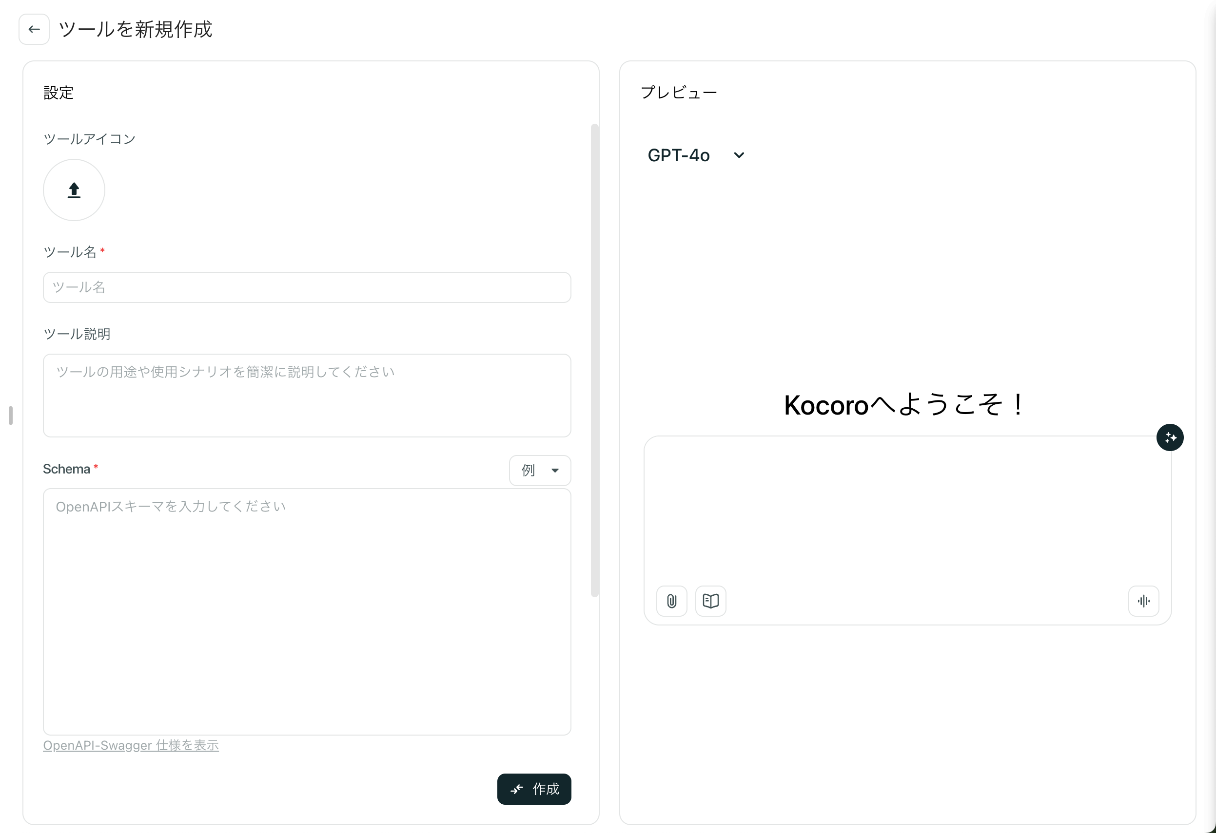 OpenAPIに不慣れな場合は、入力欄下の「OpenAPI-Swagger仕様ページを見る」で詳細ガイドを確認するか、開発者に相談してください。正確なSchemaはツールが正しくAIに呼び出される前提です。