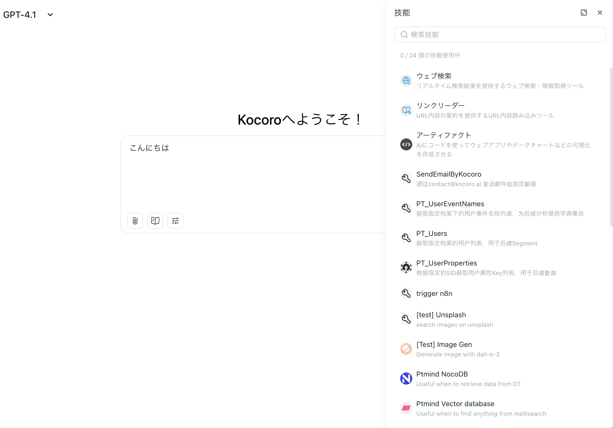 • プリセットツールボックス:Kocoroにはウェブ検索やグラフ生成などの汎用ツールが内蔵されており、すぐに利用できます。