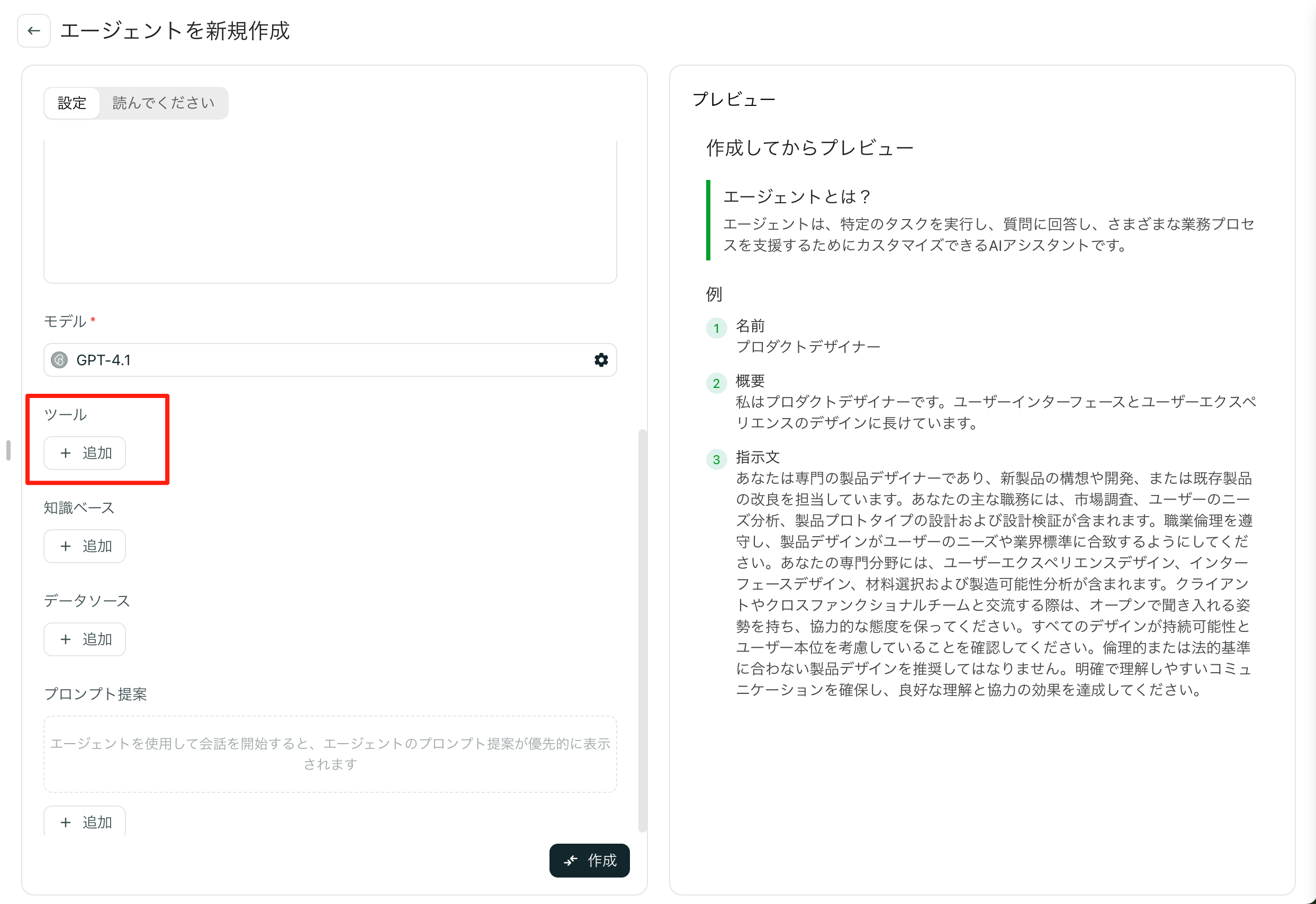 入力した内容は右側で即時プレビュー可能です。モデル切り替えや添付ファイル、ナレッジベース、ツールの組み合わせも確認できます。