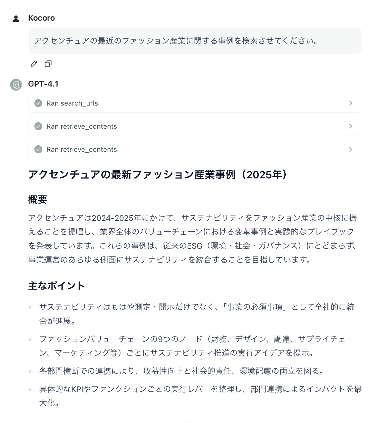 - 指示例2:「『ファッション業界の最新AI活用事例』を検索してください。」