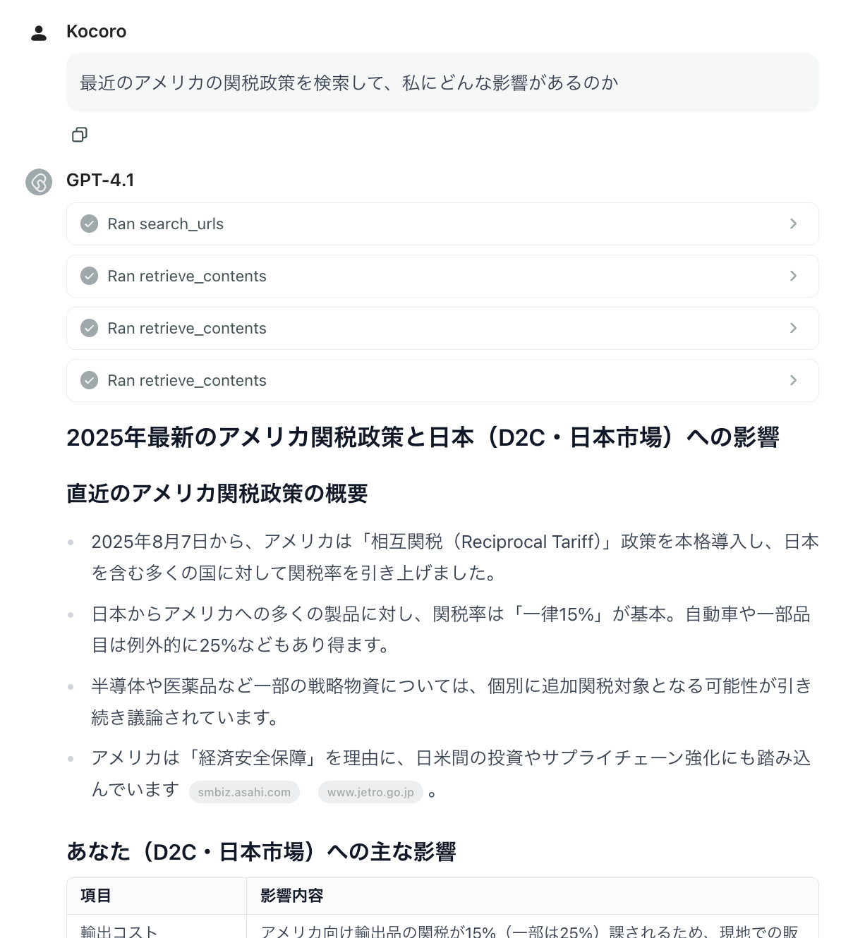 - 指示例1:「ユーザーが特定業界の情報を尋ねた場合、『全ネット検索』ツールで関連レポートやニュースを探し、要点をまとめてください。」