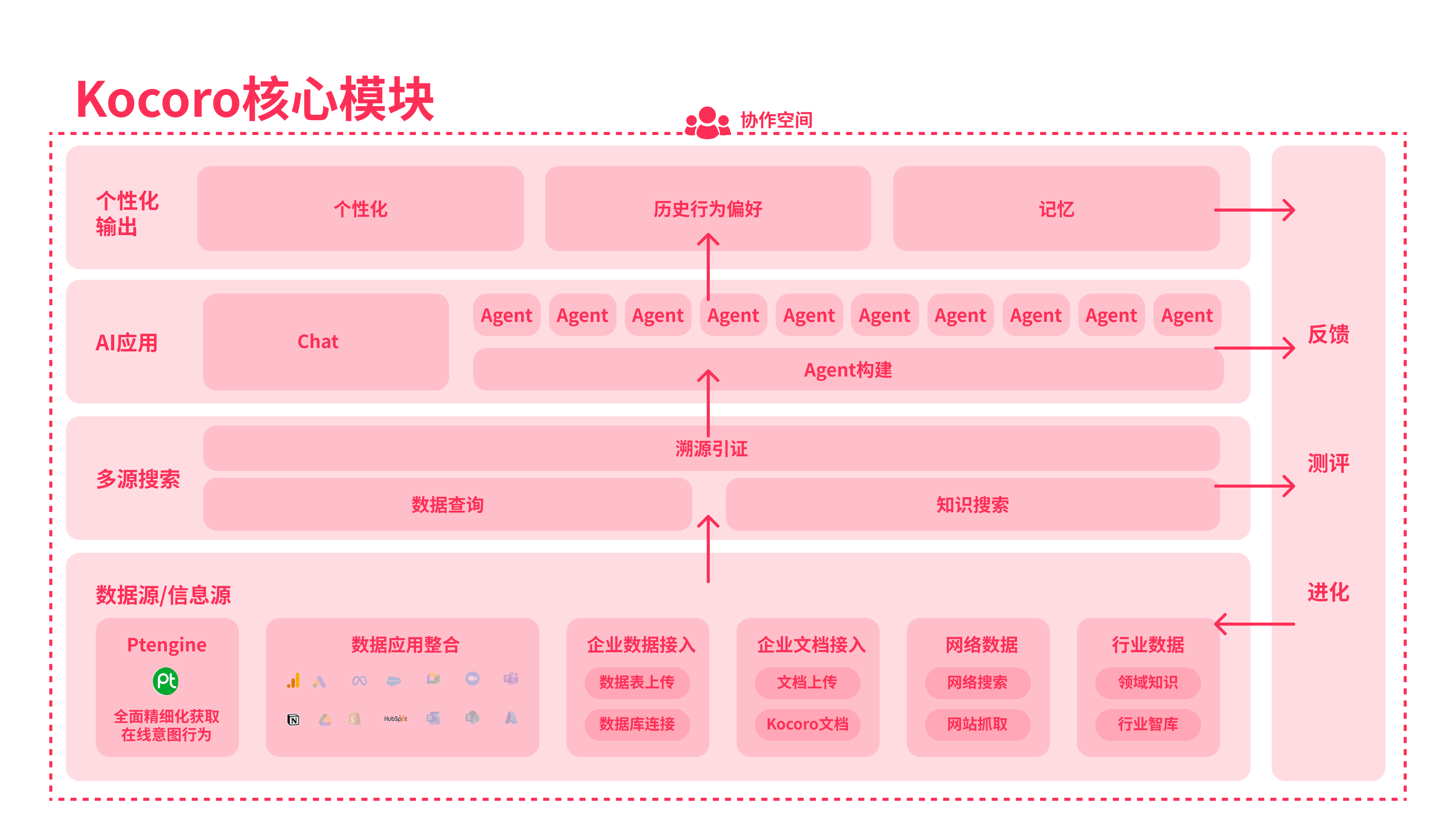 Kocoro是一个以智能协作空间为核心理念的平台,旨在通过数据驱动与AI智能,赋能团队成员高效协作与知识共享。平台整合多层智能模块,实现数据采集、知识搜索、AI处理与个性化输出的闭环,并通过独立的评估机制不断自我优化和进化。