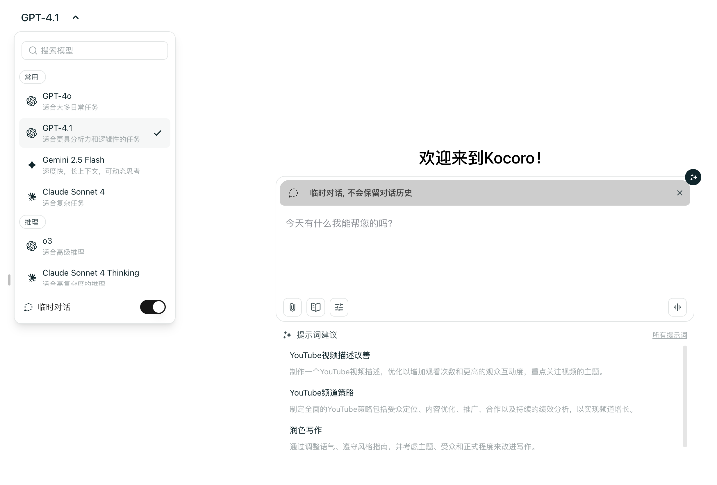 - 临时聊天模式:需要处理一些敏感信息或进行快速测试吗?开启“临时聊天”,对话内容将不会被保存,充分保护您的隐私。