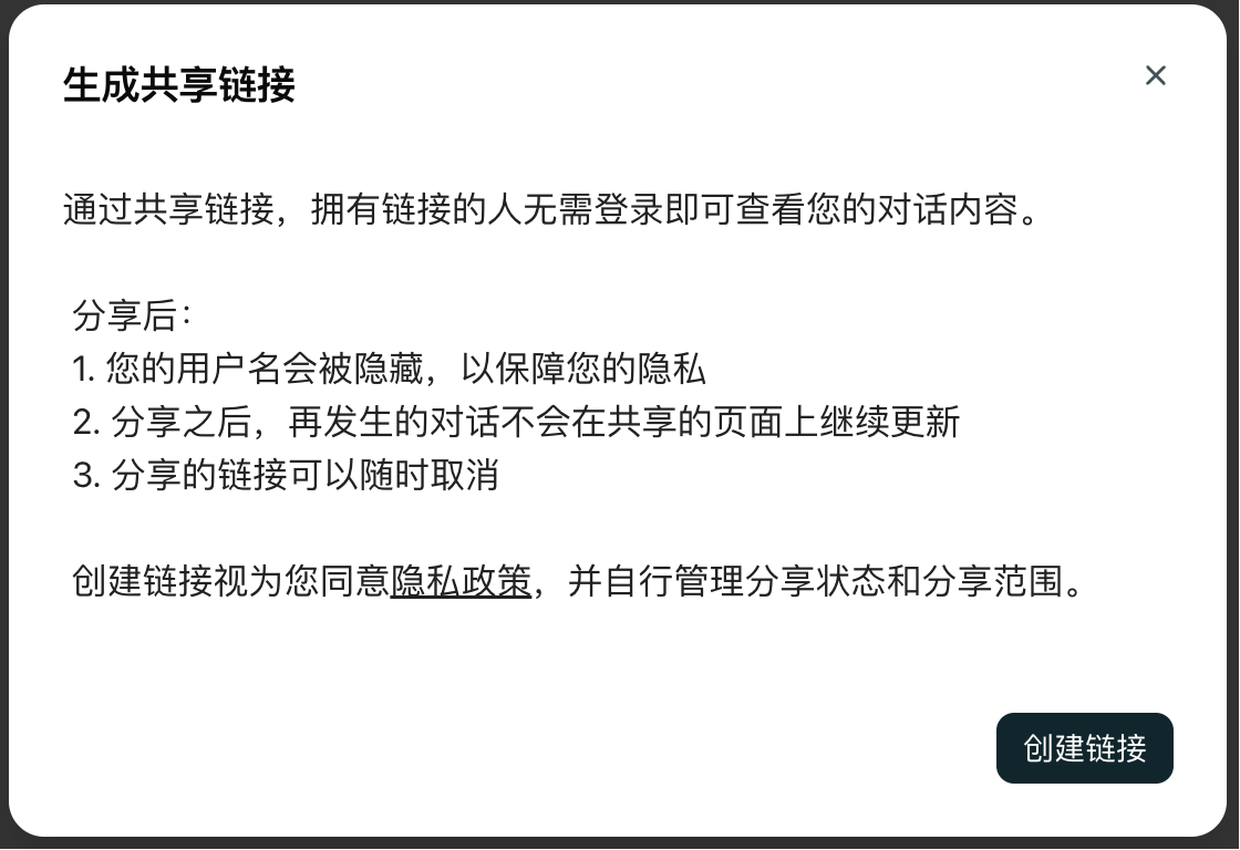 选择 “共享”,您可以生成一个专属链接,与同事或朋友分享本次对话。