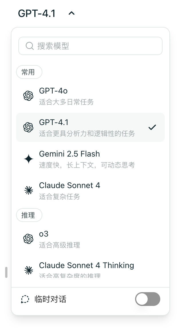 每个模型下方都有一句贴心的介绍,告诉您它最擅长做什么。比如,处理日常邮件和文案,选“GPT-4o”就又快又好;如果需要进行复杂的市场分析,可以试试“推理”分类下的专家模型。