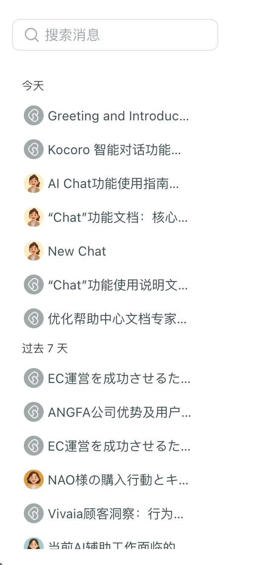 在Kocoro界面的左侧,您可以看到所有的对话记录。它们已经按照时间顺序为您排好,并用“今天”、“过去7天”等标签进行了分组,让您一目了然。只需点击任何一个标题,即可在主窗口打开完整的对话内容。