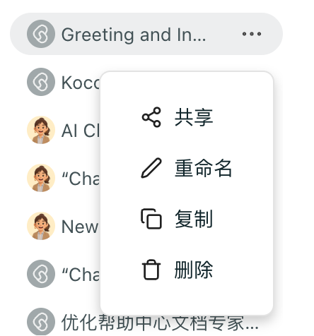 将鼠标悬停在您想管理的对话标题上,右侧会出现“更多”选项图标。点击后,包含以下操作:
