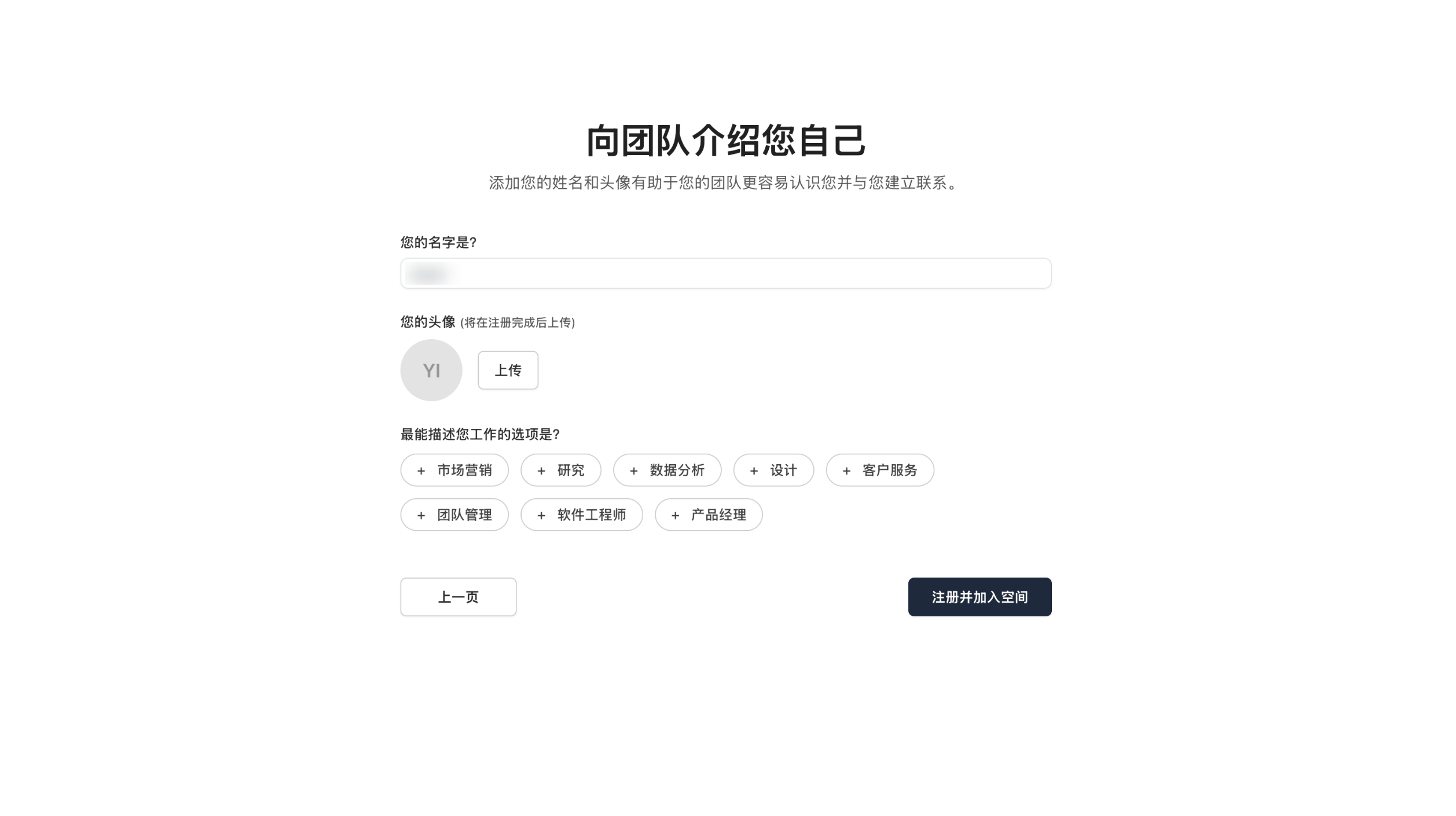 填写名字或团队熟悉的昵称,让您的伙伴在协作时更容易找到您。