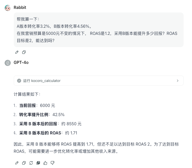 - 指令示例2:“A渠道上周广告花费了15,000元,带来了45,000元的销售额,算一下ROAS。”