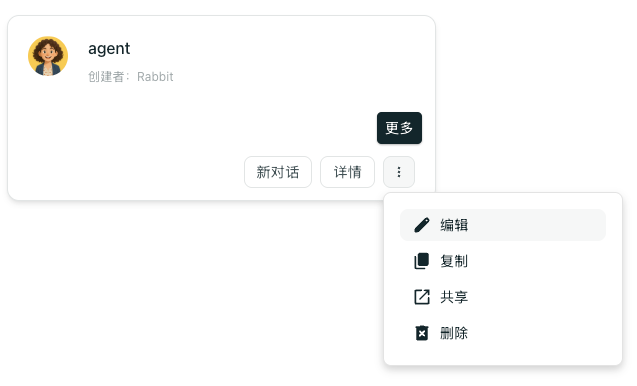 在您想要分享的资源卡片上(智能体、提示词、知识文档、工具均支持),点击右下角的“更多”按钮(三个点),在弹出的菜单中选择“共享”。