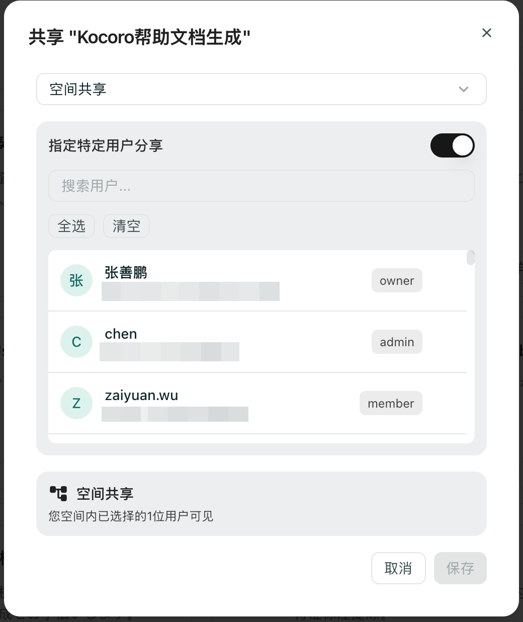 • 精细权限控制:在空间共享模式下,您可以选择将资源开放给空间内的“所有成员”,或仅分享给“指定用户”,实现更灵活的权限管理。
