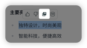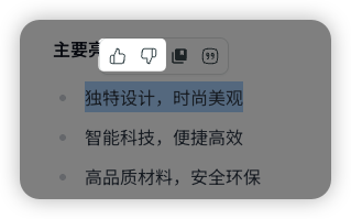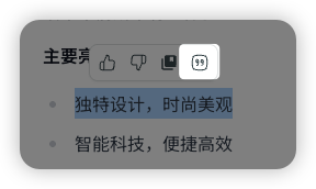 无须整段复制,也不必中断对话。当您在内容中选中任意片段时,系统会为该选中区域提供快捷操作,帮助您更高效地反馈、沉淀和继续讨论。