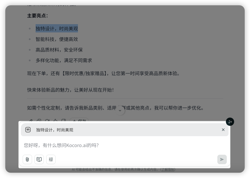 - 自然延续上下文:将选中段落引用到下一轮对话中,沟通更顺畅。